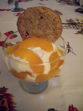 Nous sommes gourmands dans la famille, une coupe à la crème de mascarpone aux pêches et son sablé aux noix.