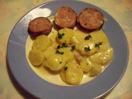Ajoutez de l'eau si nécessaire. Hors du feu, ajoutez la càs de crème fraîche. Laissez chauffer 2 minutes. J'ai servi avec une saucisse à cuire, cuite à part dans l'autocuiseur.