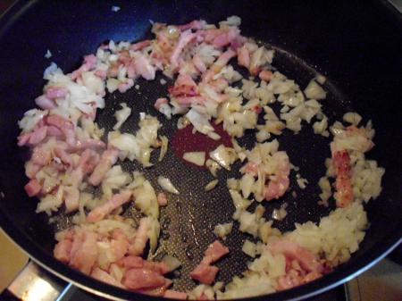 Mettez les lardons et l' oignon émincé dans une poêle sur feu doux.