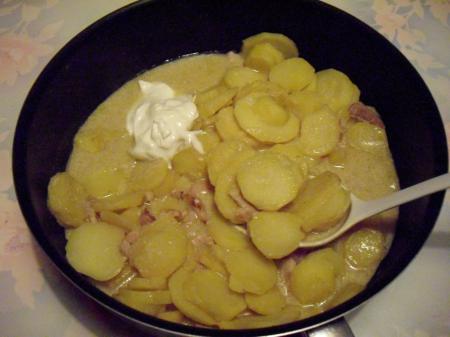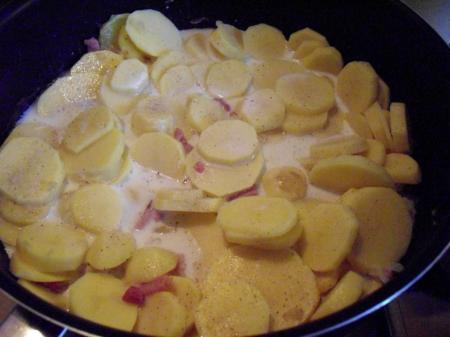 Mettez les pommes de terre dans la poêle. Versez le lait par-dessus. Salez, poivrez. Couvrez et laissez cuire à feu doux 30 minutes en remuant pour que les pommes de terre n'attachent pas.