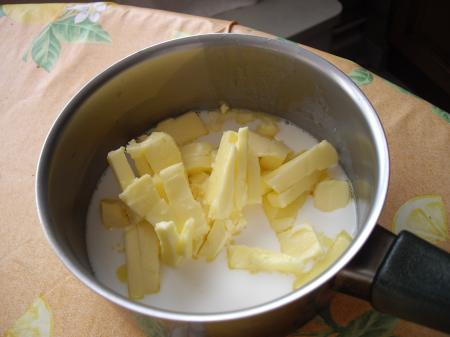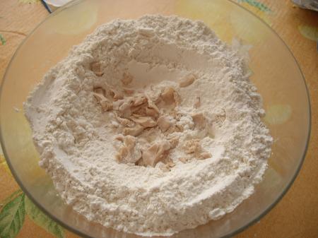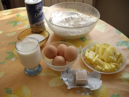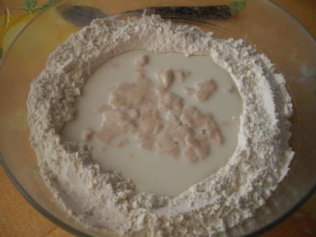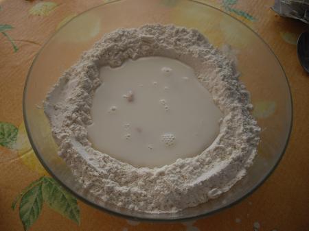 Faites une fontaine et mettez la levure émiettée. Faites à peine tiédir la moitié du lait et versez-le sur la levure.