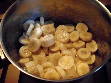 Pelez les bananes et coupez-les en rondelles dans le jus obtenu.