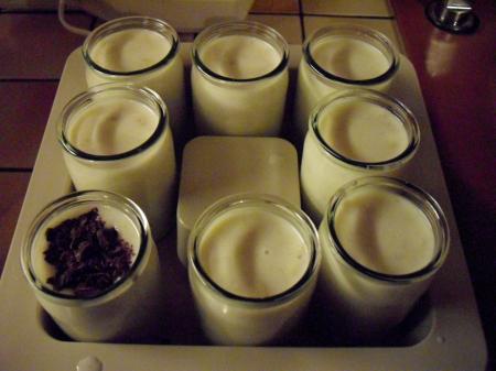 Répartissez dans les pots et parsemez le chocolat concassé sur vos yaourts.