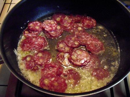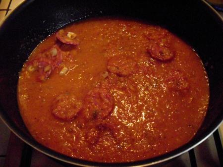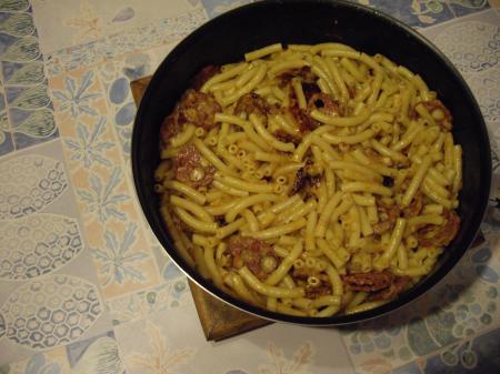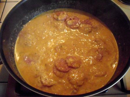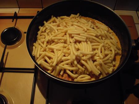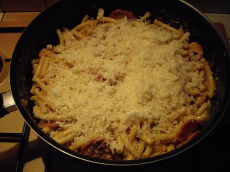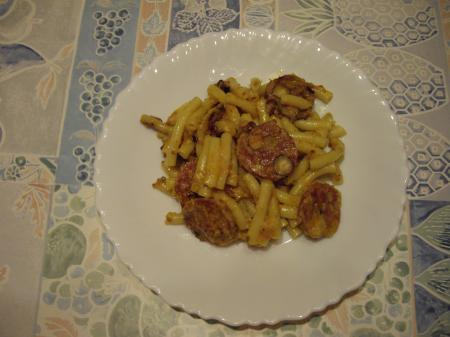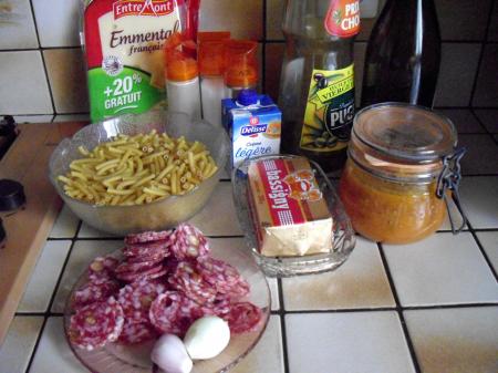Faites chauffer l'huile et le beurre dans une sauteuse. Y faire suer l'oignon et l'ail 5 minutes. Ajoutez le saucisson, puis le vin et faites réduire. Ajoutez la sauce tomates et assaisonnez de sel, poivre et muscade. Faites cuire 20 minutes. Incorporez la crème. Entre-temps, faites cuire les pâtes et égouttez-les. Ajoutez-les à la sauce et mélangez. Incorporez l'emmental. Mélangez. Servez aussitôt. Bon appétit! Vous pouvez retrouver d'autres recettes italiennes sur ce lien. Vous pouvez retrouver d'autres idées de plats de porc sur ce lien.