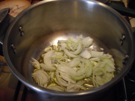 Versez un peu d'huile d'olive dans la cocotte minute et faites revenir les oignons coupés en lanières quelques minutes.