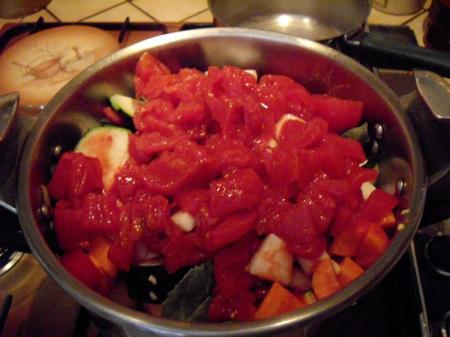 Ajoutez les tomates pelées, l'ail, le persil,le maggi et le bouillon cube.