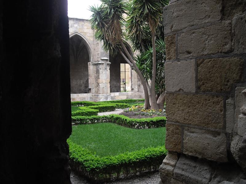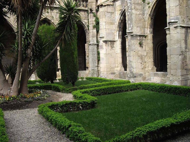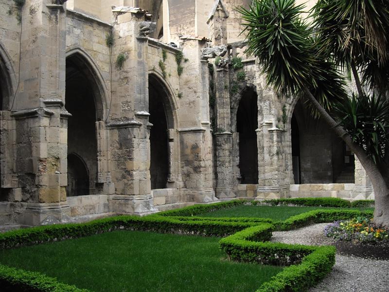 On observe dans ce cloître fleuri, les hautes voûtes gothiques de ses galeries.