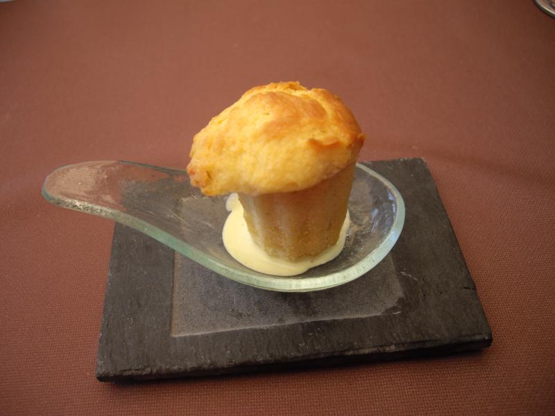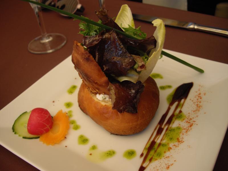 En entrée, brioche maison au chèvre frais, ciboulette, noix et vinaigrette au miel de pays...