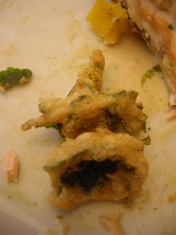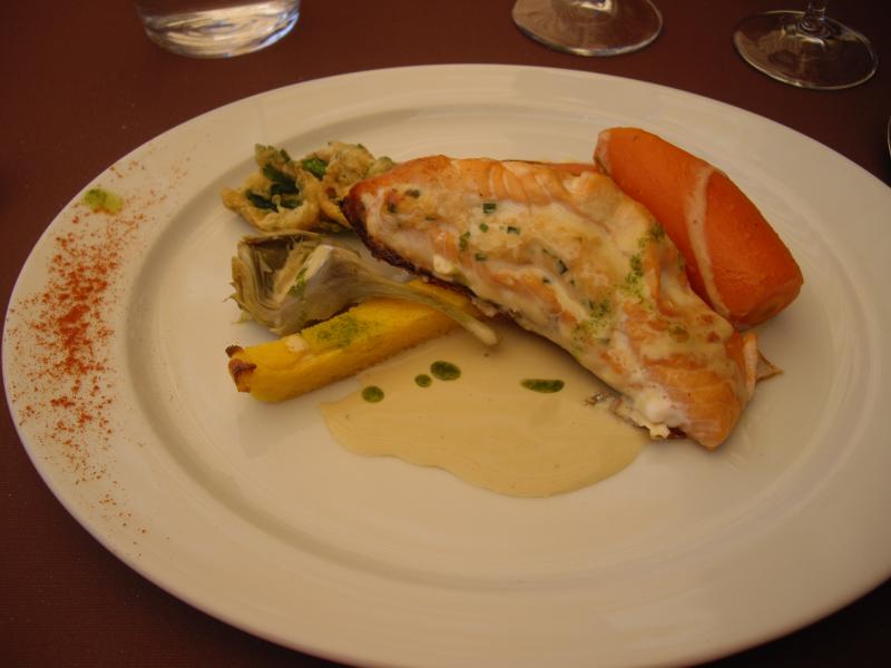 En plat, saumon plancha à la mousseline d'herbes aromatiques et fine crème de crabe vert...