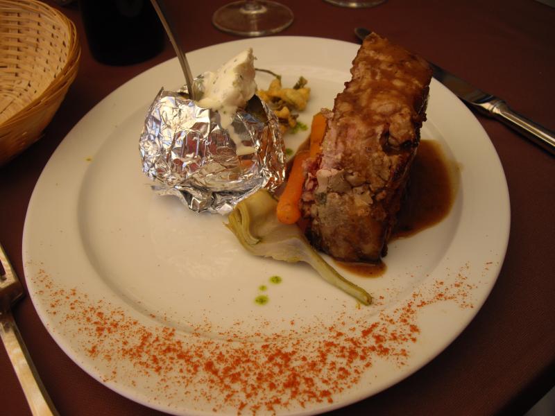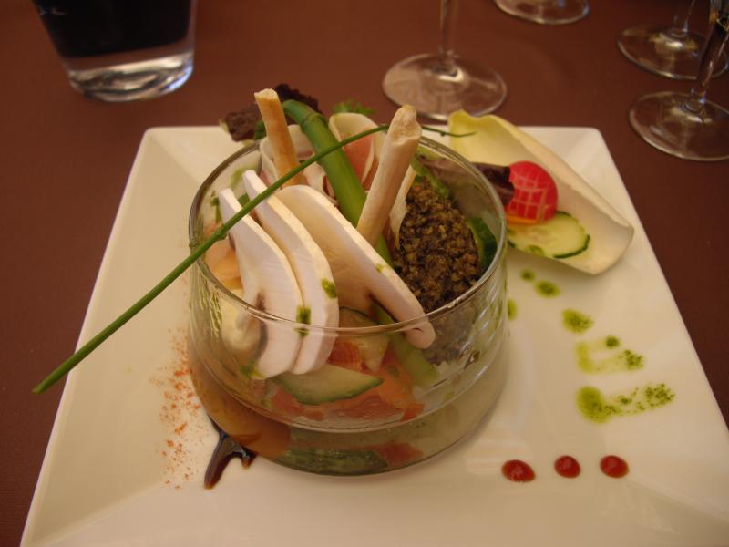 ...ou terrine de mascarpone au parmesan, légumes craquant, tapenade, jambon de la montagne noire.