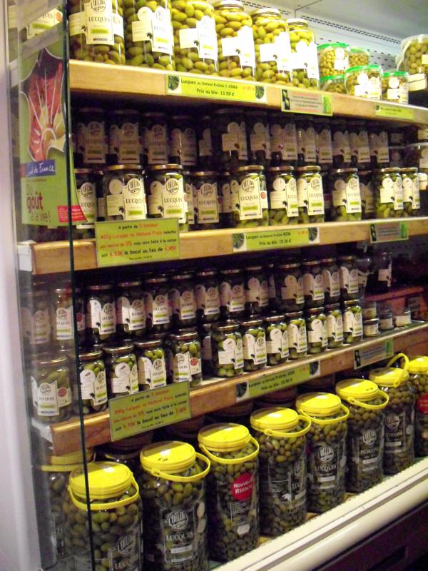 À côté des rayons consacrés à l'olive, nous découvrons un vaste assortiment de produits de la région. Mais nous sommes plutôt intéressés par les Lucques...