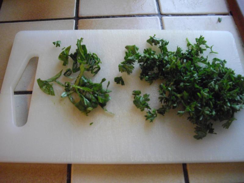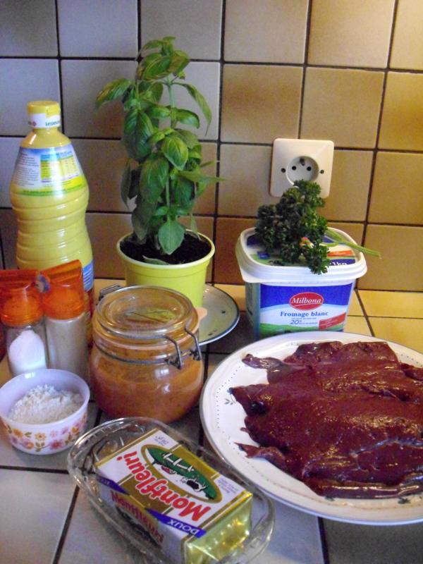 -foie -2 càs de farine -huile et beurre -1 bocal de sauce tomates(voir la recette sur ce lien) -basilic -persil -100g de fromage blanc Hachez le basilic et le persil.