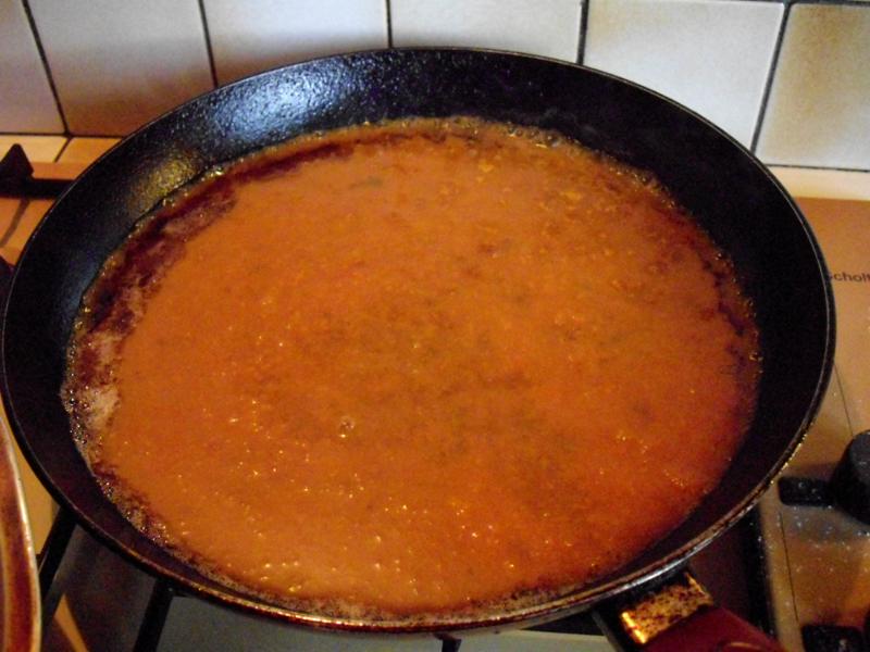 Faites chauffer l'huile et le beurre dans une poêle et faites revenir les tranches de foie 3 à 5 minutes de chaque côté. Réservez. Versez la sauce tomates dans la poêle et faite-la mijoter quelques minutes.