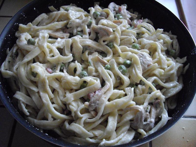 -des pâtes fraîches Je vous invite à regarder l'article dans lequel je réalise des pâtes fraîches, pour cela cliquersur ce lien. -des petits pois -des lardons -1 boîte de champignons -1 gousse d'ail -persil -1 brique de crème fraîche ou 2 suivant la quantité de pâtes -fromage rapé Faites cuire les petits pois à votre convenance, égouttez-les et réservez-les. Moi, je les aime légèrement croquants.