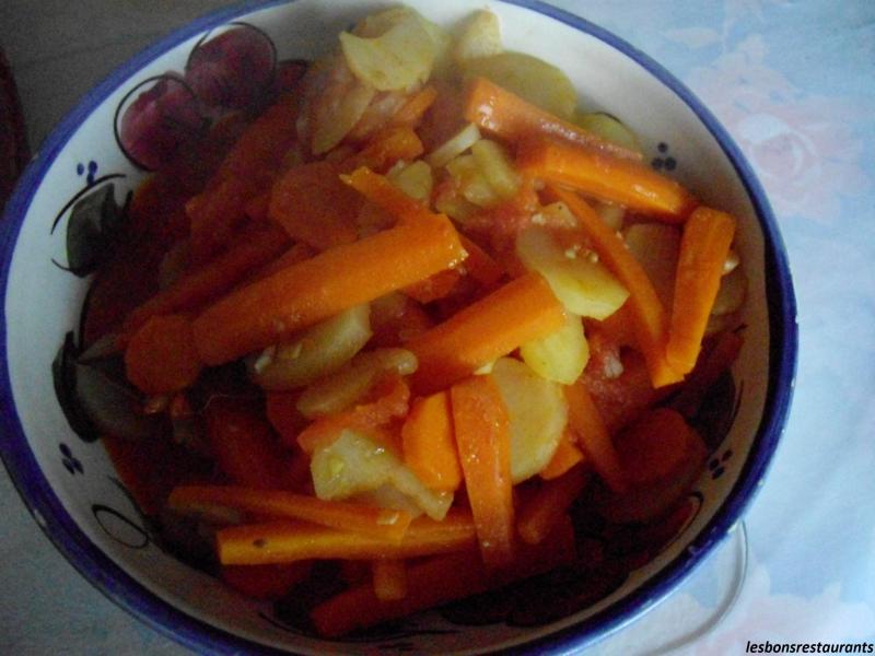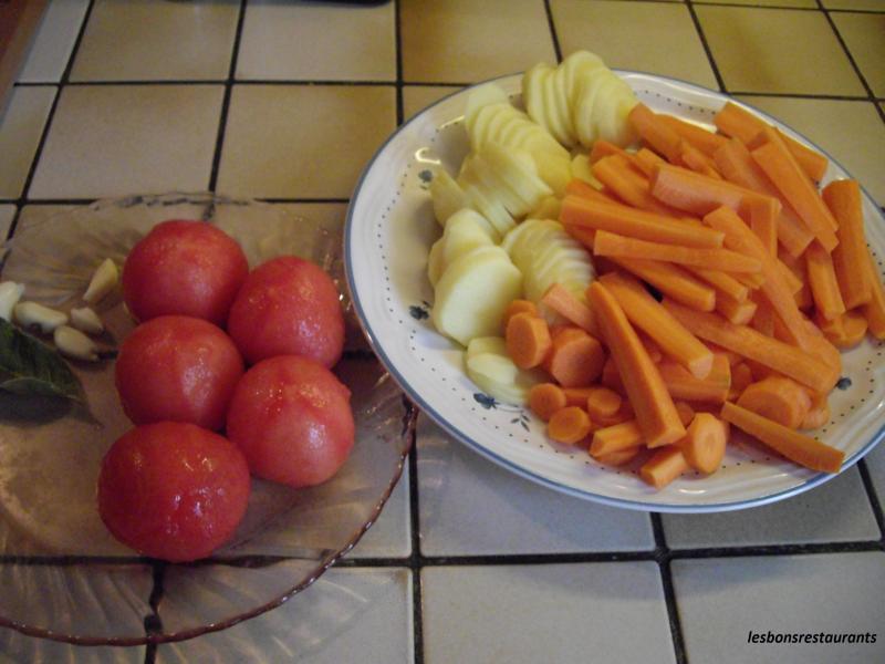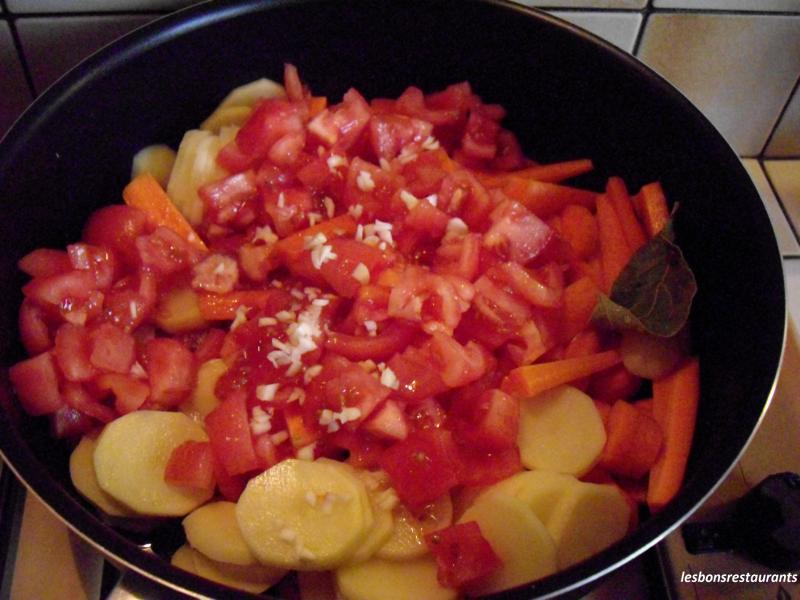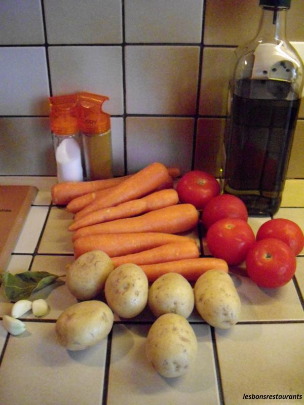 -500g de carottes -pommes de terre -tomates -ail -laurier -huile d'olive -sel, poivre -1 ou 2 càc de curry selon le goût Ébouillantez et pelez les tomates.