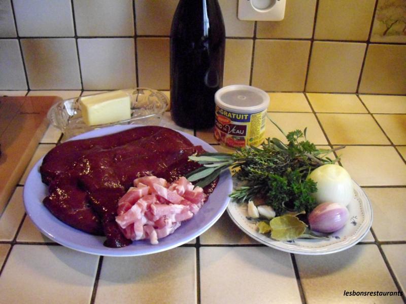 -foie de boeuf -lardons -1 verre de vin rouge -1 verre d'eau et 1 càc de fond de veau -beurre -farine -oignon, ail, persil, thym, laurier, sauge Découpez le foie en lamelles.