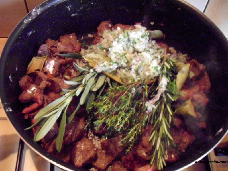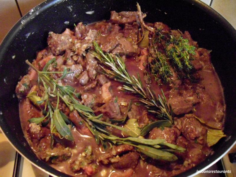 Mettez-le dans une poêle avec le beurre et les lardons. Quand il est bien doré, saupoudrez de farine. Mélangez bien. Ajoutez l'oignon, l'ail, le thym, la sauge, le laurier, le persil. Saupoudrez de fond de veau. Mouillez avec le vin rouge et le verre d'eau. Mélangez et couvrez. Laissez cuire une vingtaine de minutes.