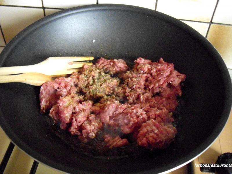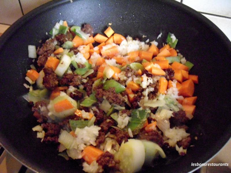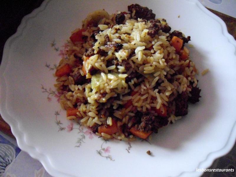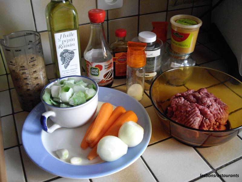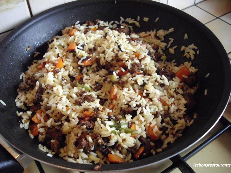 -300g de riz cuit -300g de viande de boeuf hachée -2 oignons -2 gousses d'ail -carottes -1 poireau -huile de pépin de raisin -2 càs de sauce de soja -1 càc d'arôme Patrelle -1 càc de coriandre en poudre -1 càc de curcuma -1 càc de gingembre -sel, poivre Faites chauffer l'huile dans le Wok et faites-y revenir l'ail finement ciselé. Ajoutez la viande hachée, les épices et les sauces.