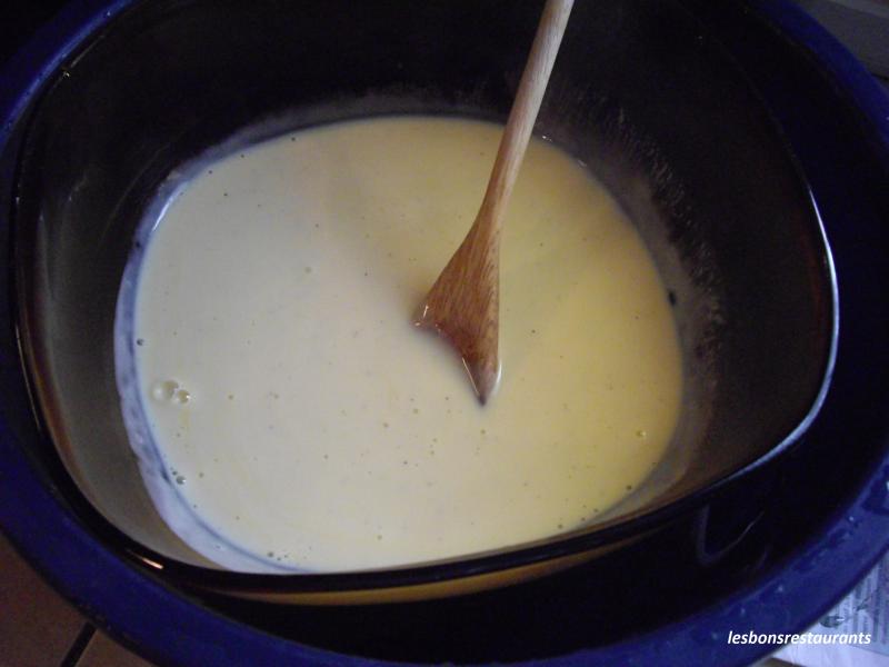 Portez à nouveau le lait à ébullition, retirez les gousses de vanille du lait et versez celui-ci dans la crème tout en remuant.
