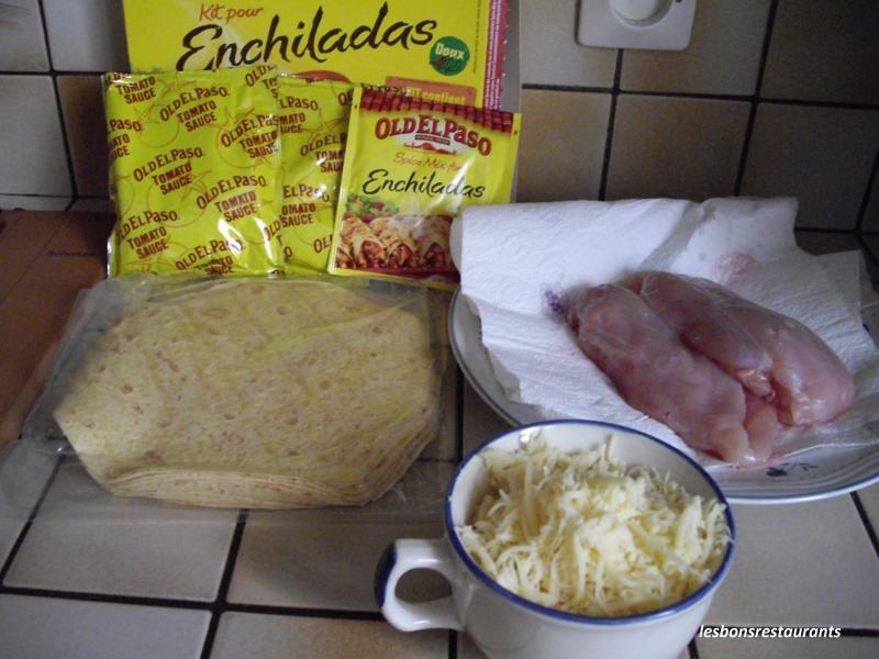 -8 tortillas -1 mélange d'épices pour Enchiladas -1 base pour sauce tomate Il faut ajouter -500g de poulet -150g de fromage râpé Coupez les blancs de poulet en lanières. Pendant ce temps, mélangez les épices avec la base pour sauce tomate et 300ml d'eau.