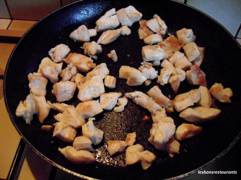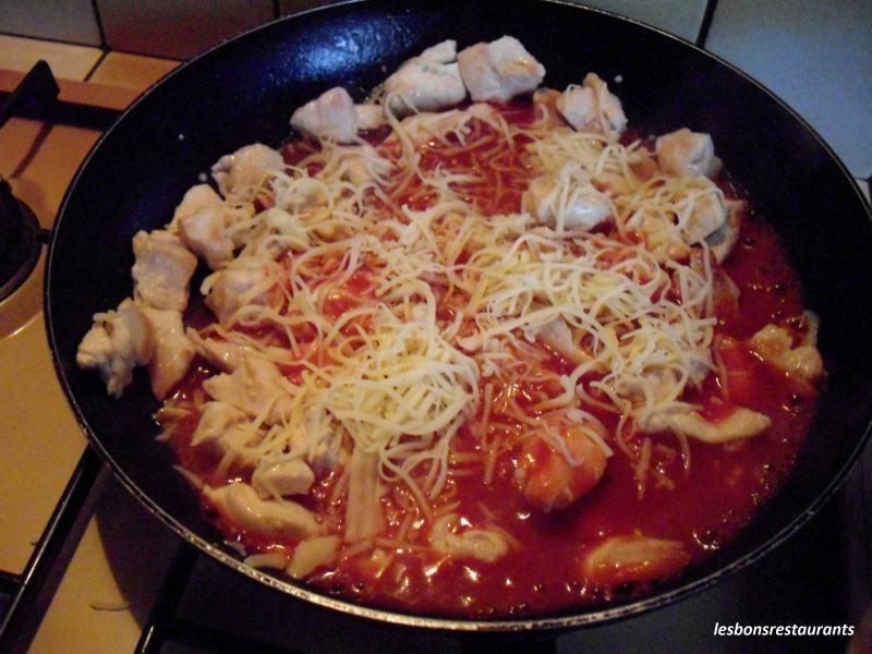 Lorsque le poulet est bien doré, versez la moitié de la sauce dans la poêle ainsi que la moitié du fromage râpé.