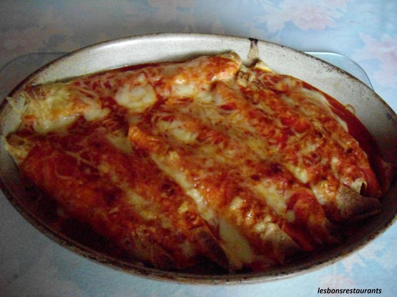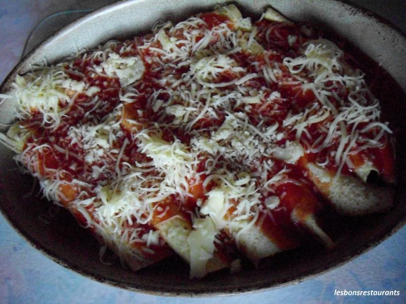 Percez le sachet de trous et placez-le 1 minute au four micro-onde. Déposez la garniture au centre des tortillas, roulez-les et placez-les dans un plat allant au four. Versez le reste de la préparation à la tomate ainsi que le reste du fromage râpé.