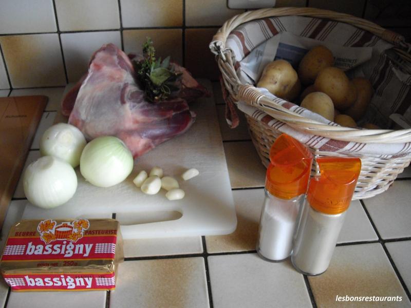 -1 gigot d'agneau -3 oignons -4 ou 5 gousses d'ail -pommes de terre -beurre -bouquet garni, sel, poivre Pelez et coupez les gousses d'ail.