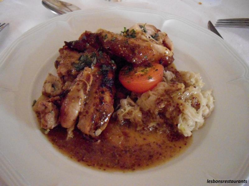 | Lors de notre dernière sortie pédestre avec l'A.N.R.(voir l'article sur ce lien), nous sommes allés déjeuner à "La Grange de Condé". Ce restaurant, situé au 41 rue des Deux-Nieds à Condé-Northen, est une ancienne ferme Lorraine. Les tables sont mises dans une salle de réception, et, déjà, l'ambiance est au beau fixe. Le feu dans la cheminée nous incite à nous installer autour de cette chaleur réconfortante. Un kir vin blanc-cassis commence ce repas. Roger s'occupe d'alimenter le feu afin que la chaleur se diffuse dans cette grande salle. Terrine de campagne maison accompagnée de son panaché de racine du jardin. Pour le plat suivant, alors que l'assiette est servie...pour nous, c'est encore la surprise! Porcelet rôti à la broche et sa chartreuse de légumes de saison... Nous avions une choucroute à la moutarde ancienne....un vrai délice. ...et son gratin dauphinois à la crème double. Une crème caramel aux oeufs frais pour finir cet excellent repas. Bonne table, accueil chaleureux, à recommander si vos pas vous mènent à Condé-Northen, lors d'un voyage dans la campagne mosellane.