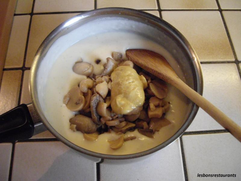 -jambon blanc -champignons -1 càs de moutarde forte -fromage râpé -1/2 litre de sauce béchamel Je rappelle les ingrédients pour la sauce béchamel: -40g de beurre -40g de farine -1/2 litre de lait -sel, poivre, muscade Préparez la sauce béchamel suivant la recette sur ce lien.