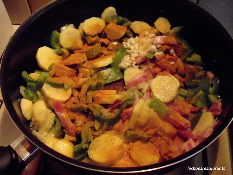 -pommes de terre -1 poivron -1 oignon -1 boîte de tomates pelées -lardons -ail -huile d'olive -sel, poivre, curcuma Les légumes sont pelés, épépinés et coupés.
