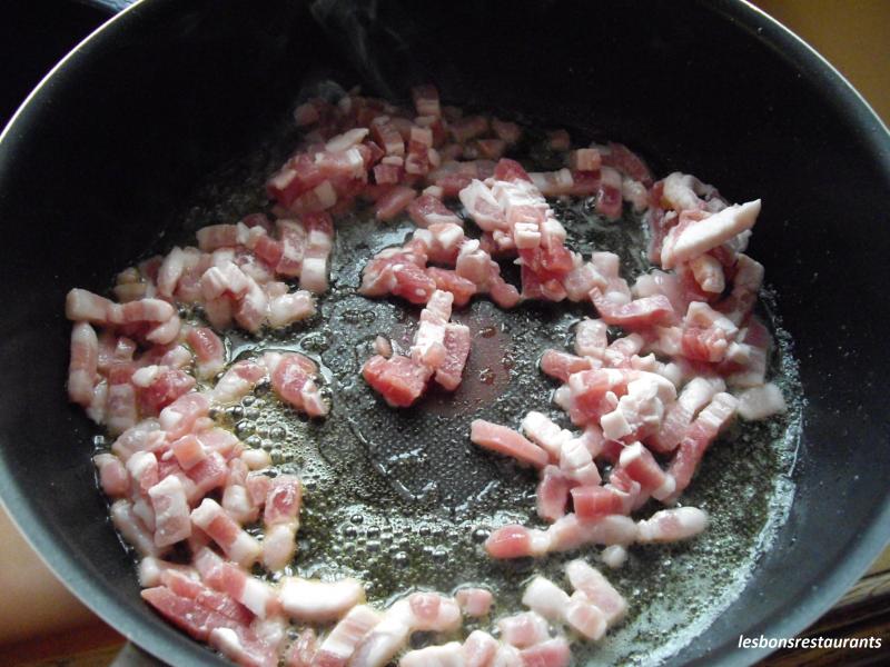 Épluchez, lavez oignon et ail. Égouttez les champignons. Faites revenir les lardons dans le beurre. Réservez-les. Faites, alors revenir les champignons dans la même poêle.