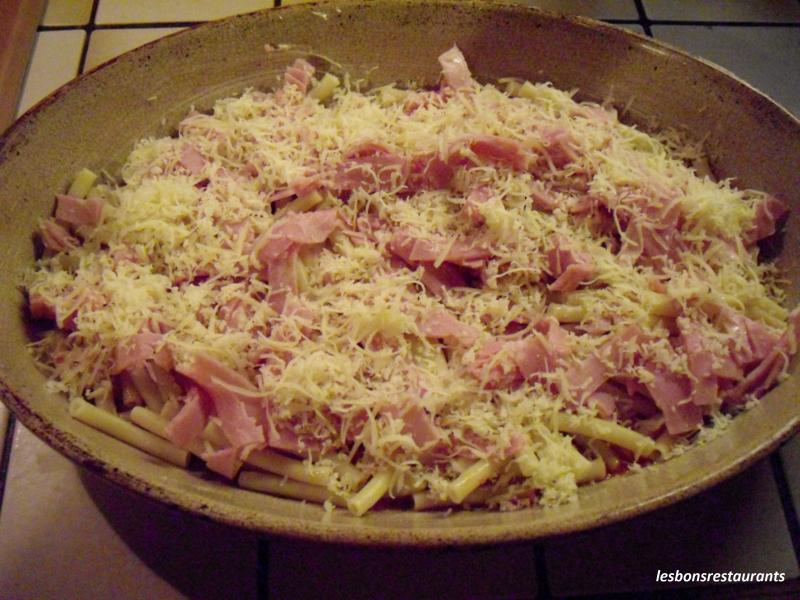 Versez une couche de sauce tomate, une couche de pâte, du jambon puis du fromage râpé. Versez de la sauce tomate.