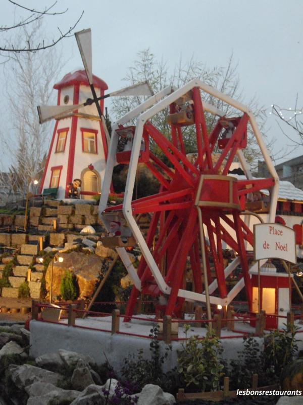 Ils chargent avec entrain le train qui va aller directement dans la garage du Père Noël. Vous apercevez de loin le moulin de maman Noël.