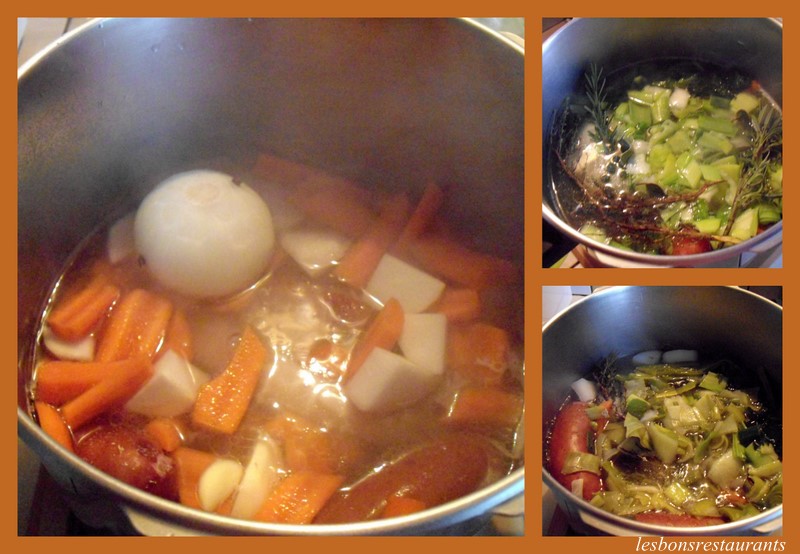 Au bout de 30 minutes, ajoutez aux viandes, carottes, navets, poireaux, céleri, oignons piqués de clous de girofle, ail et bouquet garni.