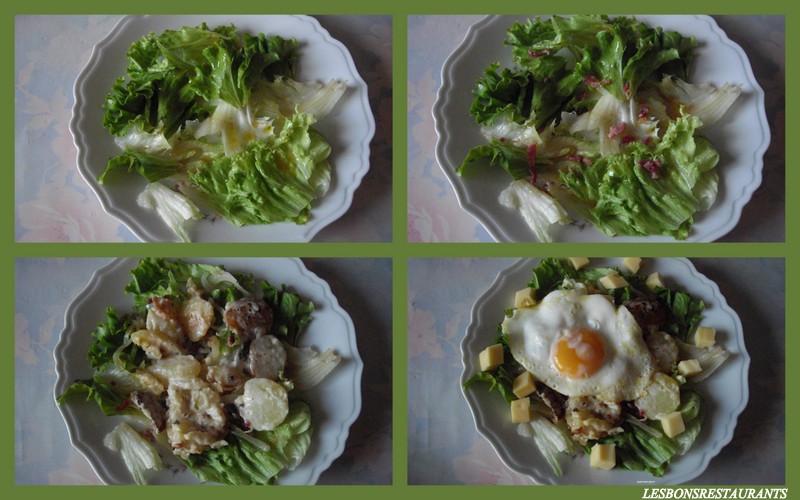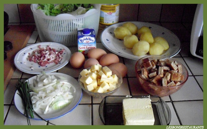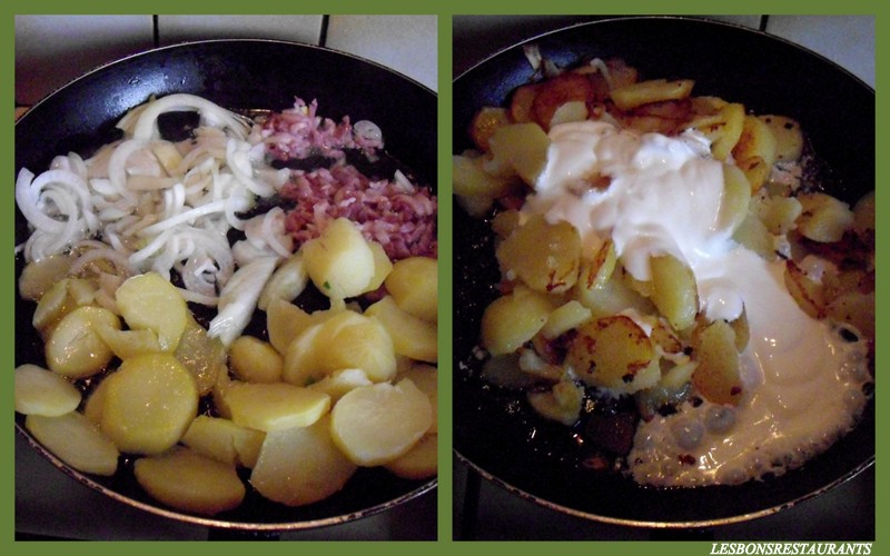 Faites revenir dans une poêle avec un bon morceau de beurre, les lardons, les oignons émincés et les pommes de terre cuites coupées en rondelles.