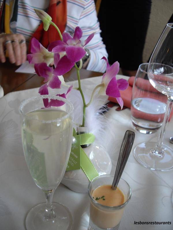 En apéritif, un kir maison nous est servi, accompagné d'un gaspacho de tomates et de concombres.