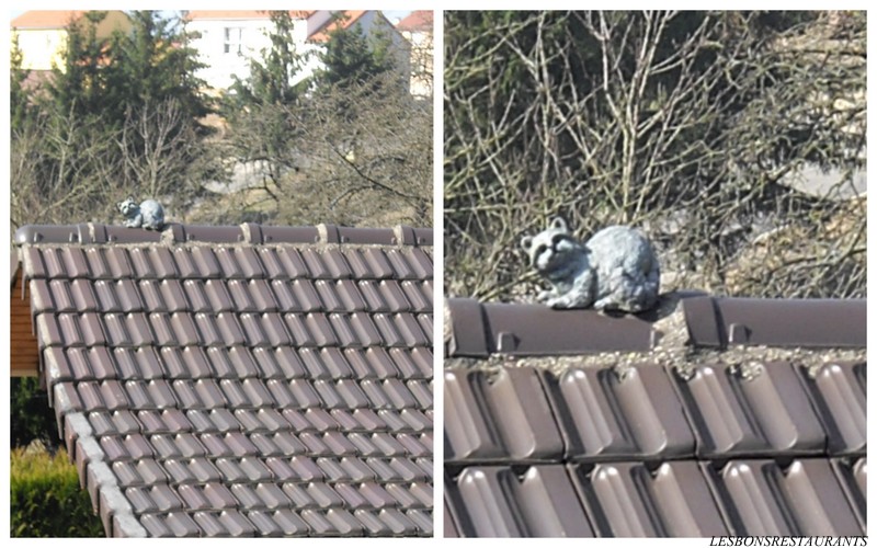 Nous sortons du village. Que voyez-vous sur ce toit? Un leurre tout à fait de circonstance sous ce beau soleil!