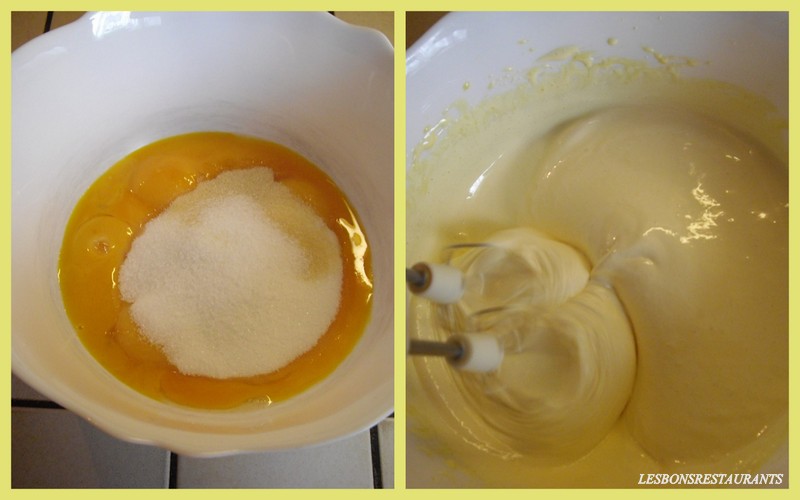 Pendant ce temps, mélangez le sucre et les jaunes d'oeufs jusqu'à ce que le mélange blanchisse, mousse et double de volume.