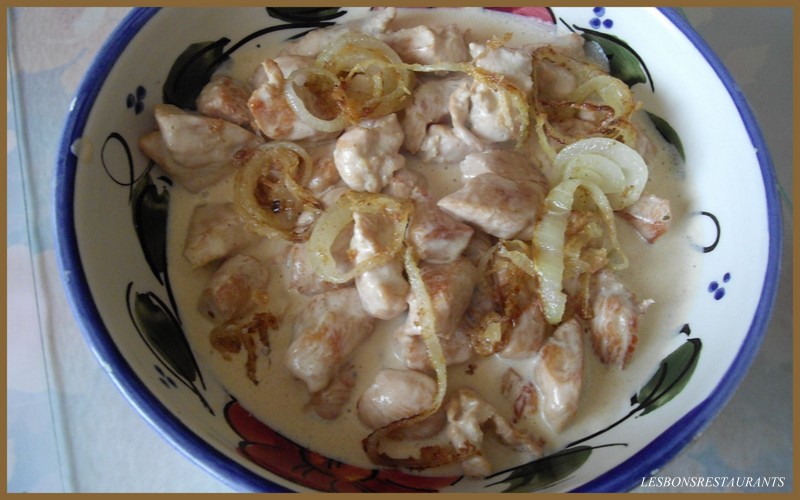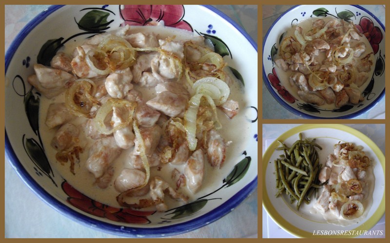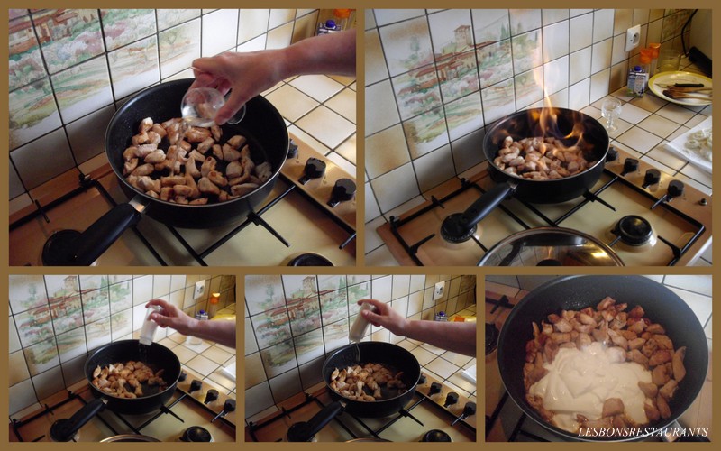 Arrosez le poulet du verre de schnaps et faites flamber. Mouillez avec le vin blanc. Salez et poivrez. Laissez mijoter 15 minutes environ. Ajoutez la crème et laissez quelques minutes sur feu doux. Éteignez le feu et laissez reposer 5 minutes...le temps de préparer vos oignons!
