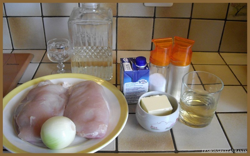 -2 belles escalopes de poulet -beurre -1/2 verre de vin blanc -1 petit verre de mirabelle -1 oignon -1 brique de crème fraîche -sel, poivre