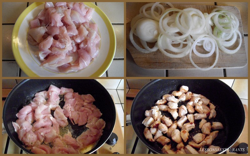 Pelez, lavez et coupez l'oignon en rondelles. Faites revenir vos dés de poulet dans une sauteuse dans un morceau de beurre jusqu'à ce qu'ils soient dorés.
