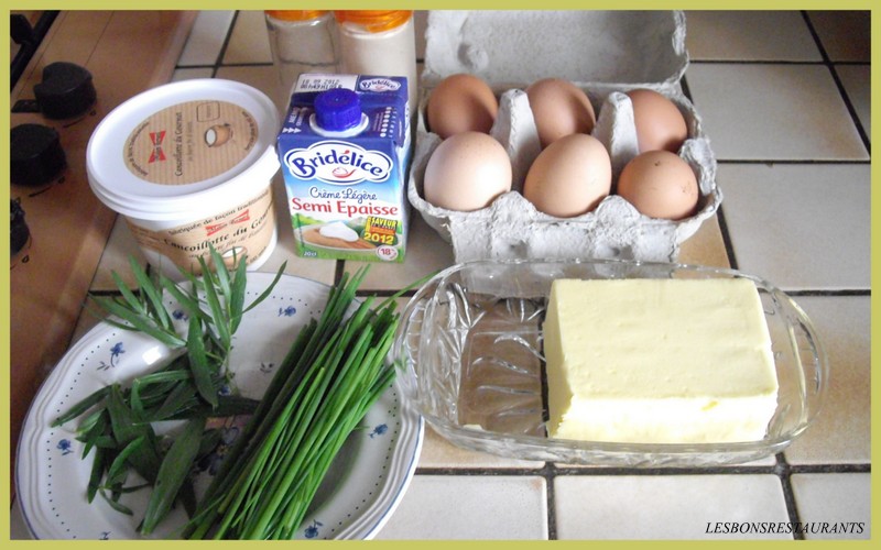 -6 oeufs(il faut compter 2 à 3 oeufs par personne) -100g de cancoillotte -1 brique de crème fraîche -beurre -sel, poivre -ciboulette, estragon