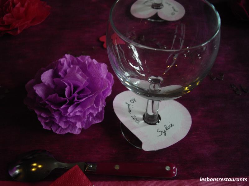 Un petit coeur enrobe le pied de chaque verre. Une très jolie façon d'indiquer la place de chaque convive.