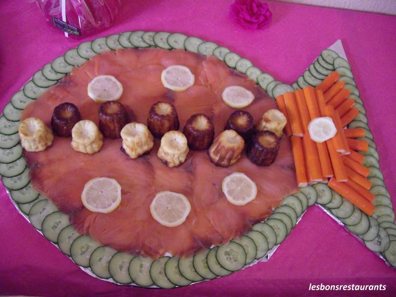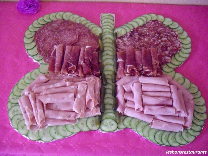 Saumon, surimi, cannelés au surimi, le tout entouré d'une jolie rangée de concombre. Après un joli poisson, ce papillon a pris son envol et s'est déposé sur notre buffet pour le plus grand plaisir de nos papilles.
