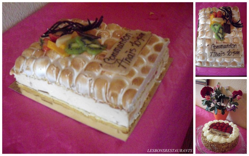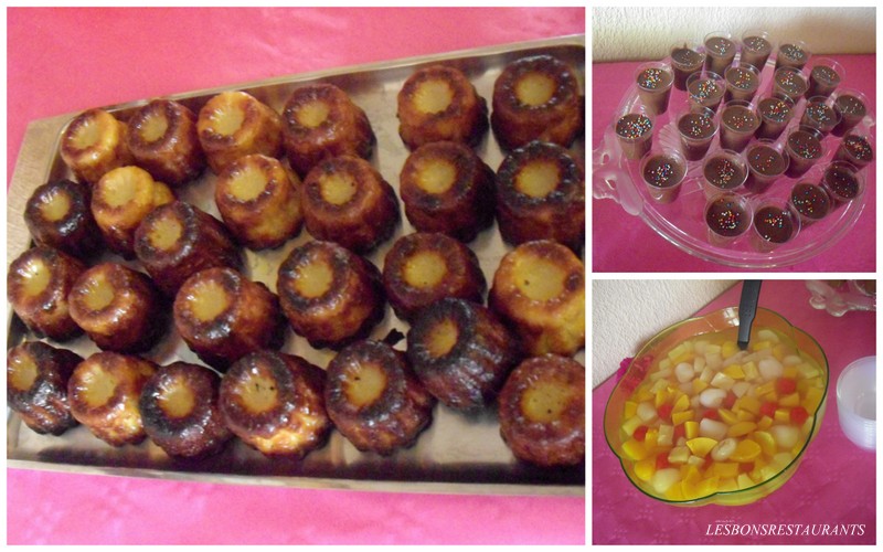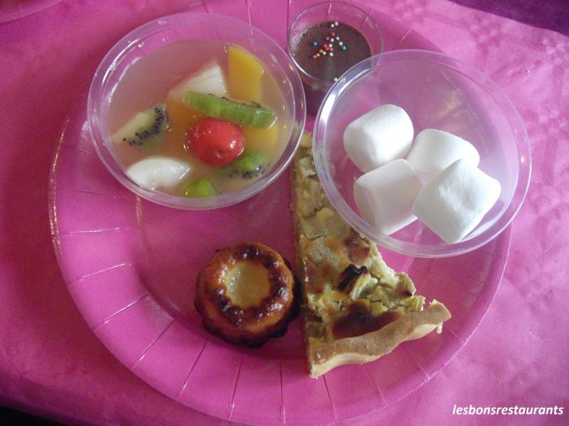 Une salade de fruits, une mousse au chocolat, un morceau de tarte à la rhubarbe, un cannelé sucré et...une coupelle de chamallows. Les gâteaux de la communion d'Anaïs sont très beaux!