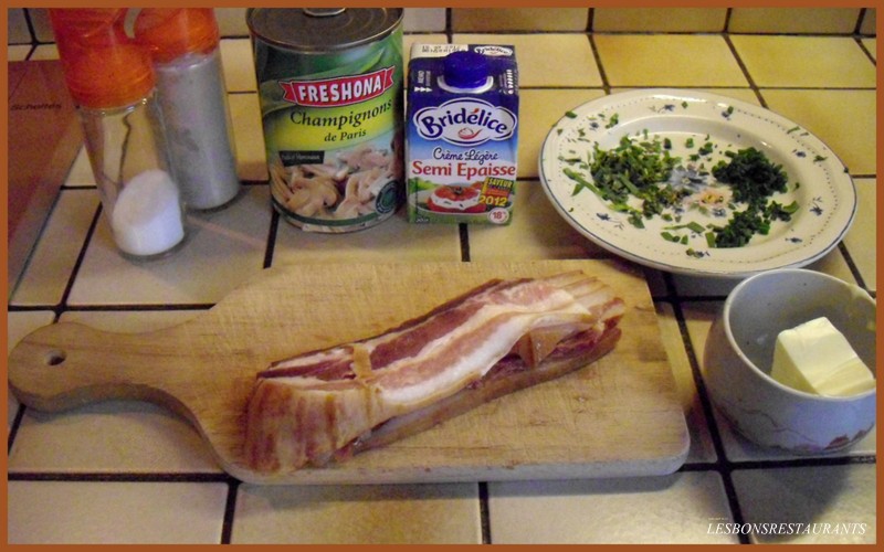 -1 boîte de champignons -beurre -1 brique de crème fraîche -un morceau de lard fumé -persil, estragon -sel, poivre