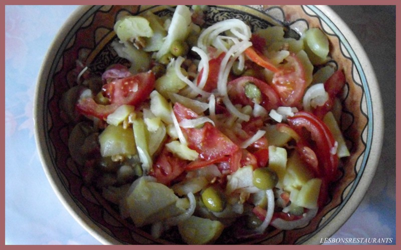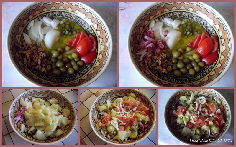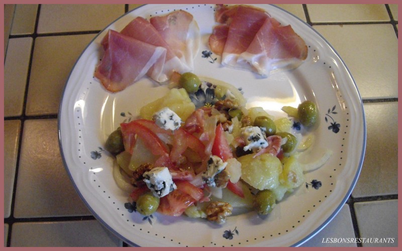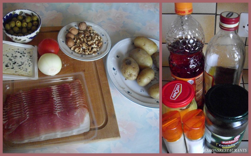 -des pommes de terre -noix -tomates -oignon -roquefort -olives vertes -jambon fumé Ainsi que tous les ingrédients pour réaliser une bonne vinaigrette! -huile d'olive -melfort -moutarde -sel, poivre -quelques cornichons