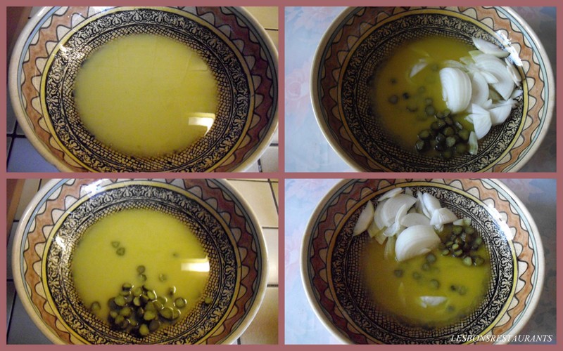 Pendant ce temps préparez votre vinaigrette. Mélangez huile et vinaigre. Salez et poivrez. Coupez les oignons et les cornichons en rondelles.
