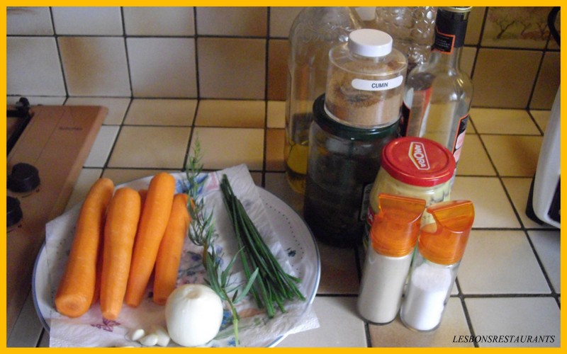 -carottes -oignon -ail -ciboulette, estragon Pour la vinaigrette: -huile d'olive -vinaigre melfor -1 filet de balsamique -moutarde -sel, poivre -petits cornichons -1 càc de cumin