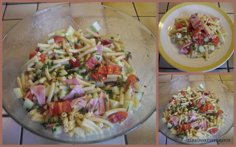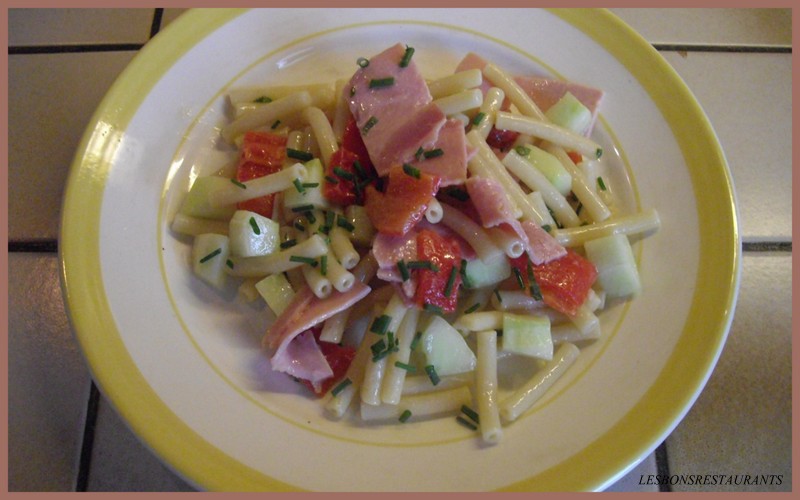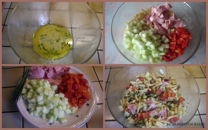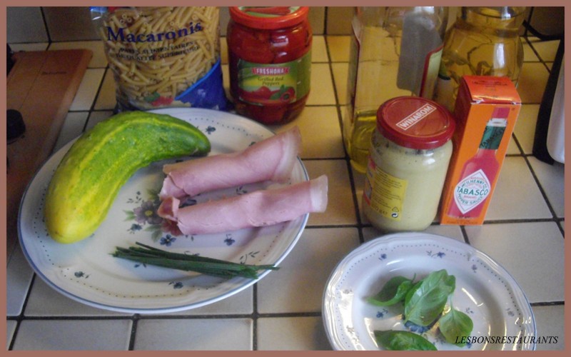 -300g de pâtes -1 concombre -poivrons séchés conservés dans l'huile -2 tranches de jambon -ciboulette Pour la vinaigrette -huile d'olive -vinaigre à l'estragon -1 càs de moutarde forte -1 ou 2 gouttes de tabasco -quelques feuilles de basilic